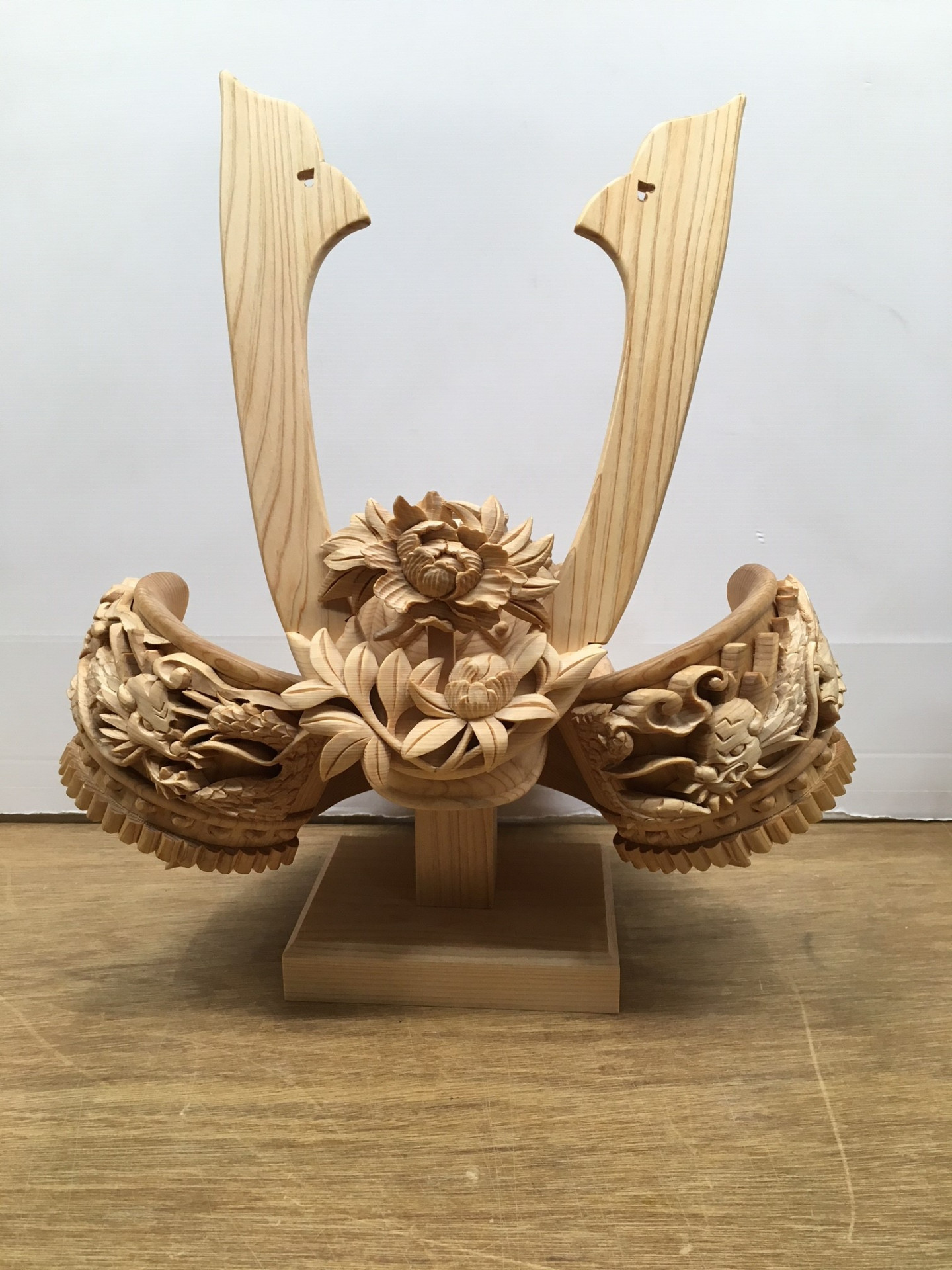 別注兜について 2020/03/21 別注兜について 以前制作しました別注兜のお客様への提案方法について説明します。 お客様より龍虎の兜をご注文いただき、前立ち部分のデザインを花に変えたいと言うご要望があり写真の様に図面を描き実物へ取り付けたようなイメージが出来る様に写真を撮りお客様へ提案をしました。 これでOKが出たので制作に取り掛かり仕上げました。 仕上がった画像が2枚目の画像になります。 今まで色んなご要望があり沢山の別注兜を製作しています。 今後も今までに制作したのを投稿して行きますのでご購入の参考にしてください。