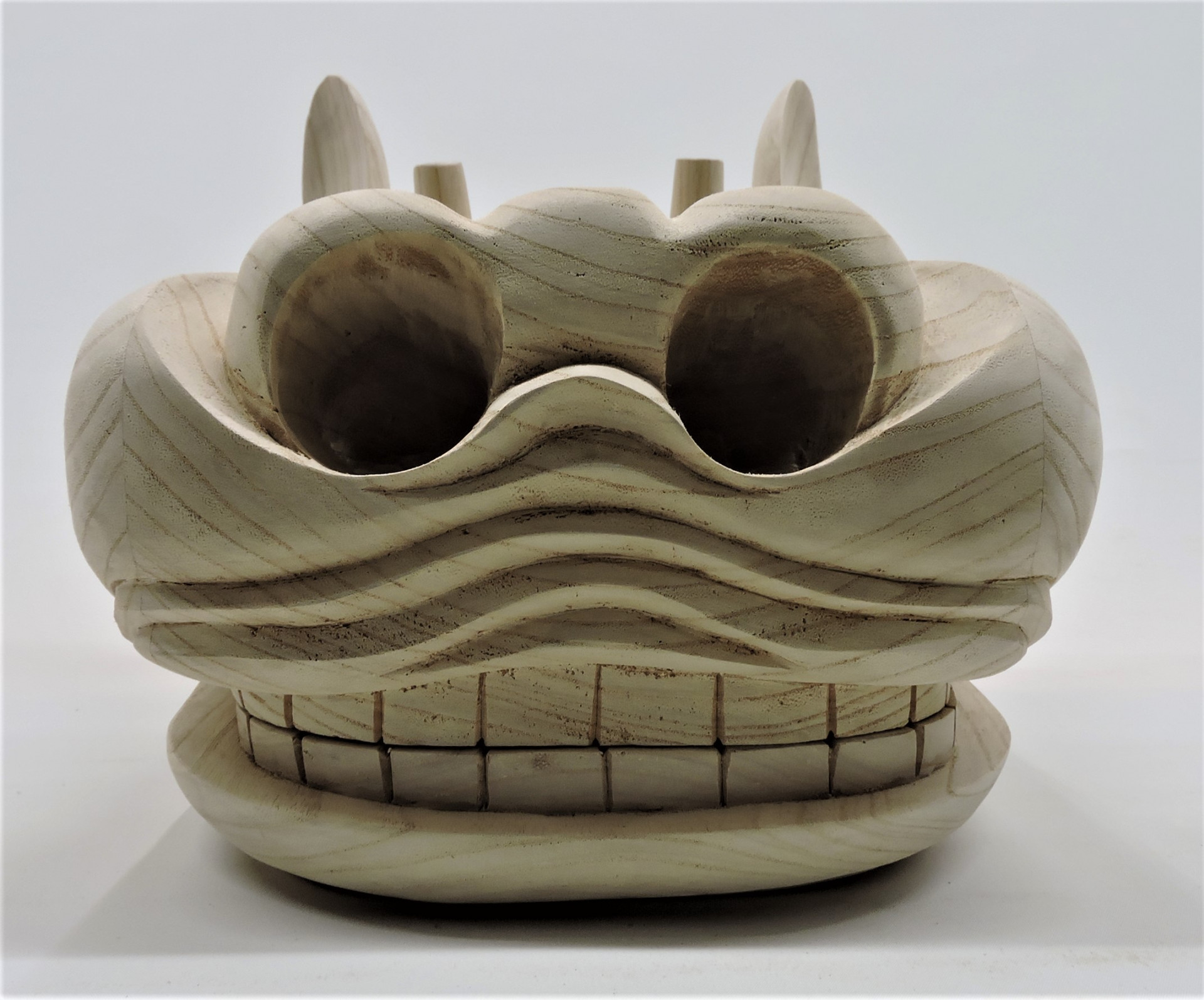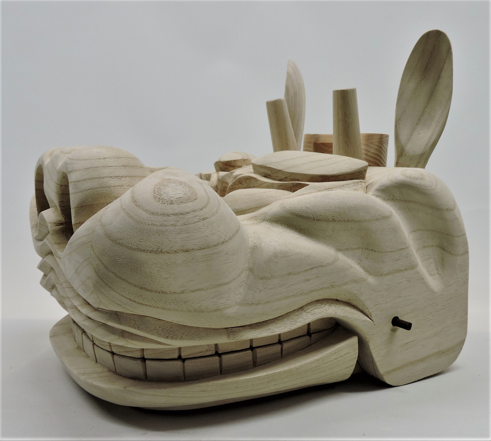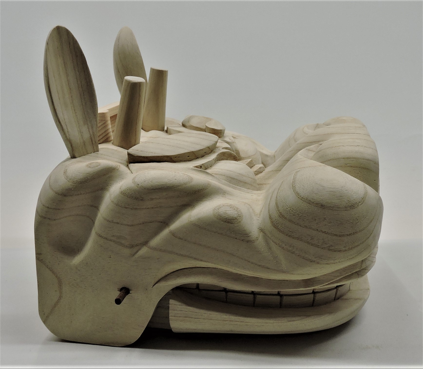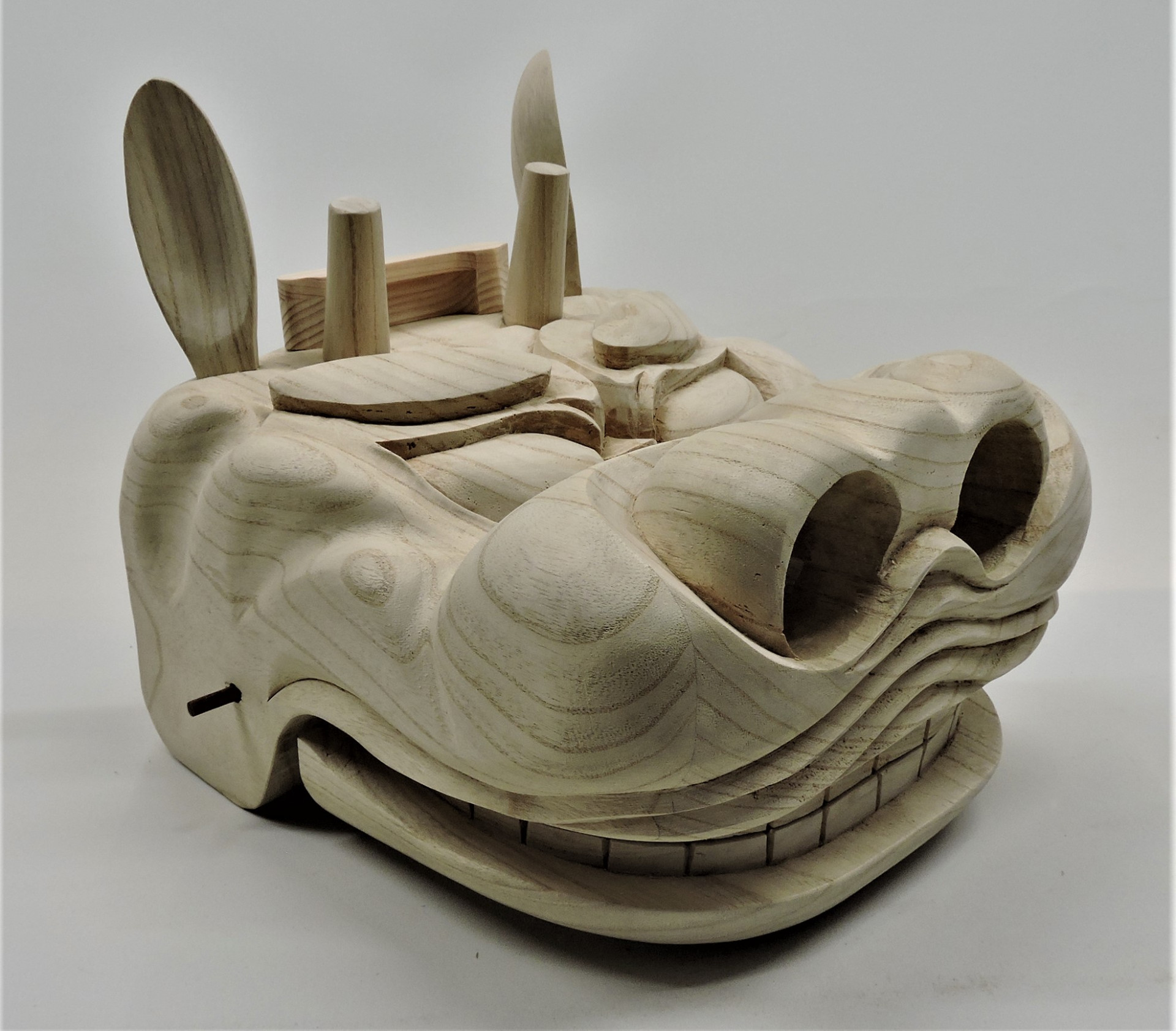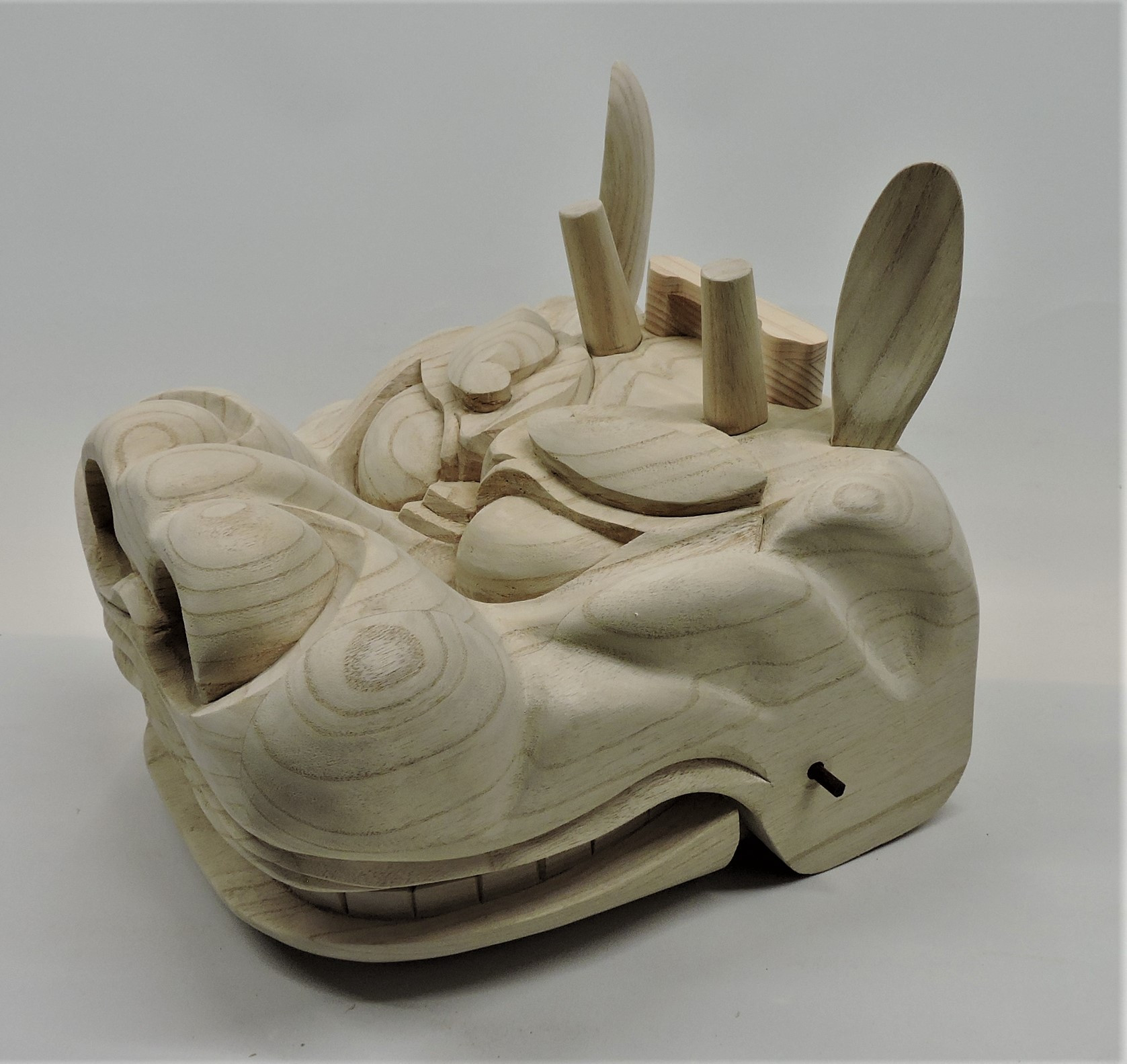 獅子頭が完成しました~~! 2020/05/15 獅子頭が完成しました~~! 獅子頭が完成しました~~! 獅子頭が完成しました~~! 香川県の神輿屋さんからの注文で子供用の獅子頭の制作を依頼されました。 獅子頭は初めて作るのでちょっと難しかったけど何とか仕上がりました。 接続の棒は仮に紫檀の棒で代用していますが、金属の棒で接続します。 口部分の歯がちゃんと合わなければいけないので調整しちゃんと合っています。 この後神輿屋さんが塗装をして完成です。