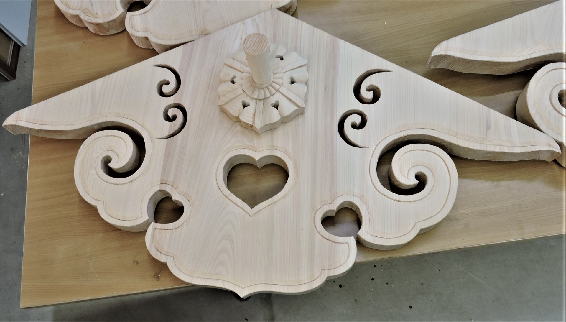 蕪懸魚4点完成しました。 2020/08/24 蕪懸魚4点完成しました。 材料は桧で幅1m110cm高さ60cm厚み5cmの蕪懸魚です。 幅が広いので3枚の材料を貼り合わせて裏にチギリを入れて固定しています。