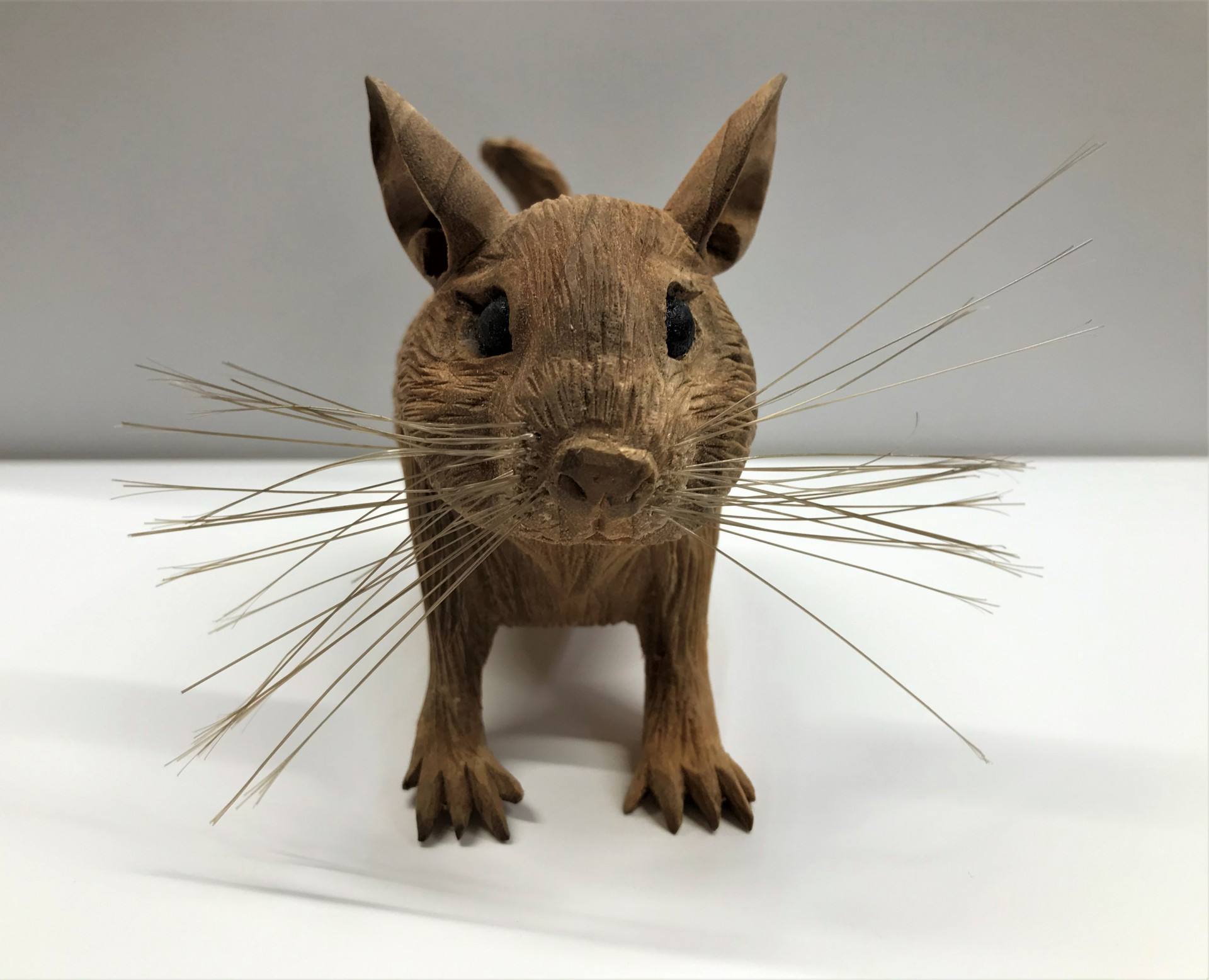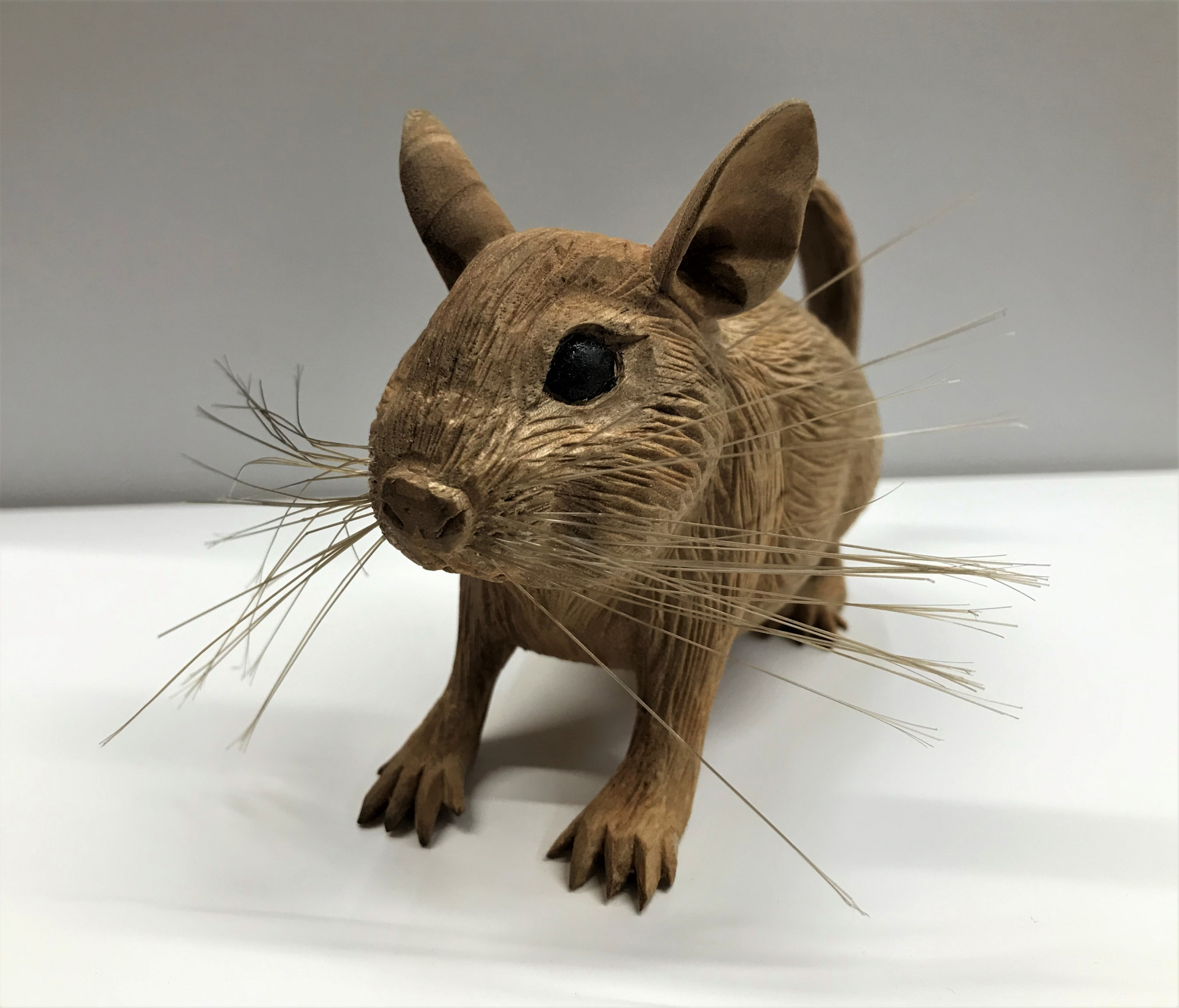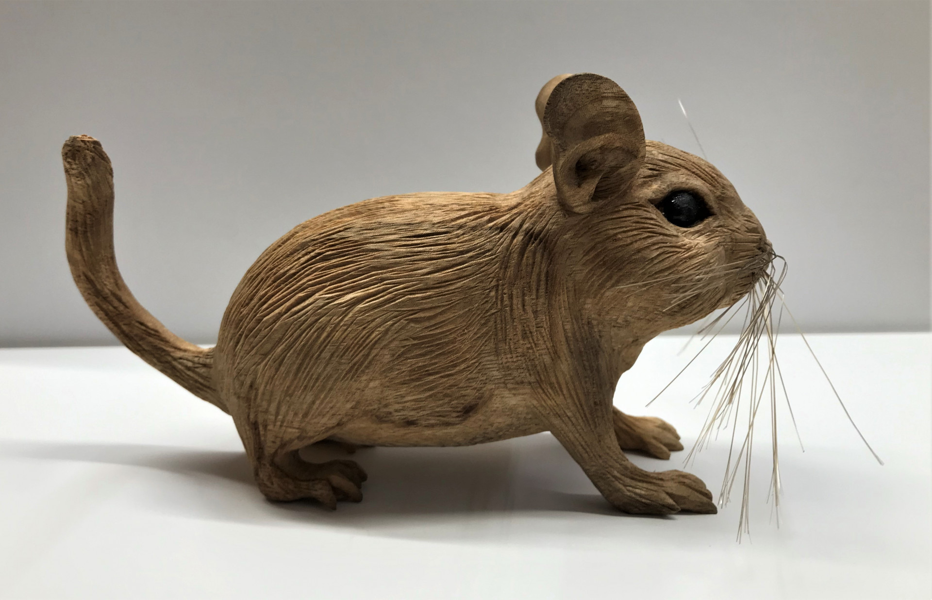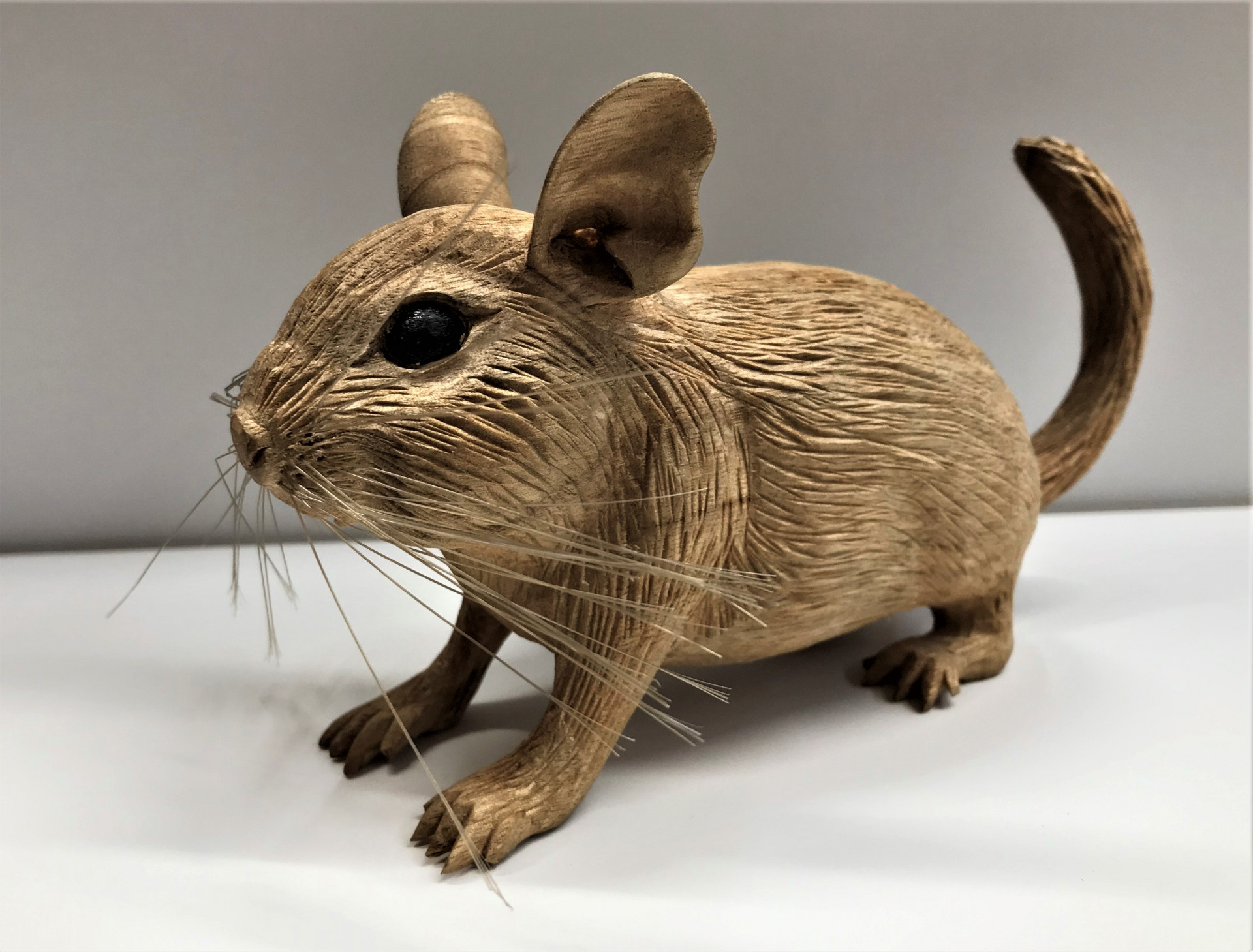 飼っていたペット(デグー)と言う動物が無くなったので残しておくために木彫りで作って欲しいと言う依頼で製作しました。 2020/09/12 飼っていたペット(デグー)と言う動物が無くなったので残しておくために木彫りで作って欲しいと言う依頼で製作しました。 デグーと言う動物を知らなかったのでネットで画像を探してよりリアルに再現できるように頑張りました。 ひげも1本づつ穴をあけて埋めています。
