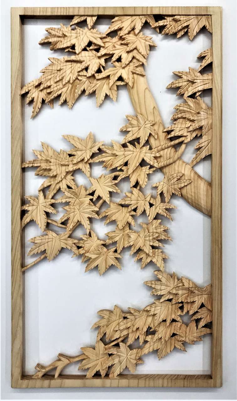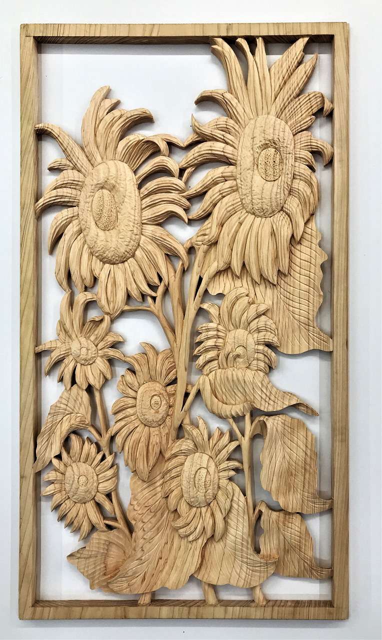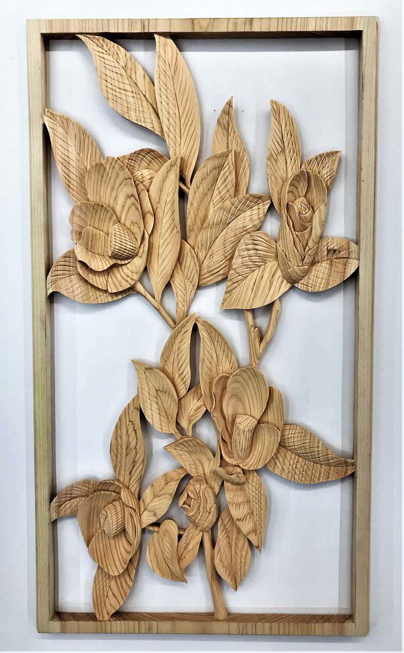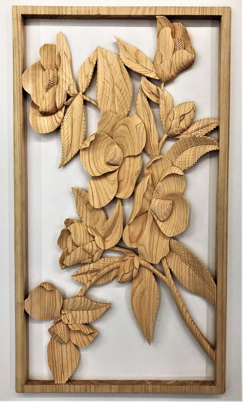 寿司店へ取り付けるレリーフ 2021/05/20 寿司店へ取り付けるレリーフが完成しました。 素材は桧で幅30cm高さ60cm厚み15mm 薄い材料から立体的に彫るのが大変でしたが何とか仕上がりました。 モチーフは山茶花・椿・向日葵・紅葉の4種類です。 山茶花と椿はよく似ていますので葉っぱの彫り方で違いを表現しています。